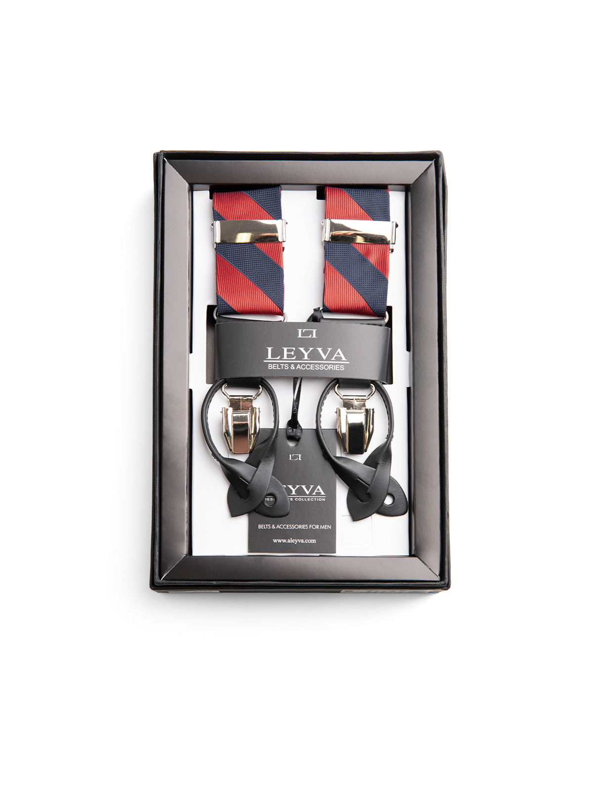 Stilrena, klassiska hängslen från Leyva. Tillverkade i Spanien med kadettrandiga sidenremmar samt utbytbara fästen i metall och äkta läder. Ett utmärkt val både för vardag och till formella tillställningar.